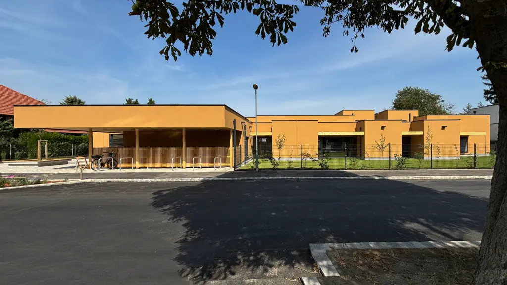 Der Kindergarten ist für vier Gruppen konzipiert und befindet sich auf einem ebenerdigen Grundstück. Die Erschließung erfolgt über einen zentral gelegenen Vorplatz, der durch einen Baum mit Sitzbank gestaltet ist. Das Gebäude wird in Massivholzbauweise errichtet, wobei die erdberührte Bodenplatte aus Beton besteht. Die Fassade ist mit einer Putzoberfläche über einer Holzfaserdämmung versehen. Der Baukörper ist sowohl in der Höhe als auch in der Tiefe gestaffelt. Trotz eines geringen Flächenverbrauchs bietet das Gebäude eine großzügige Raumwirkung. Für eine nachhaltige Energieversorgung sorgen eine Photovoltaikanlage, eine Tiefenbohrung mit Wärmepumpe sowie eine mechanische Lüftungsanlage.