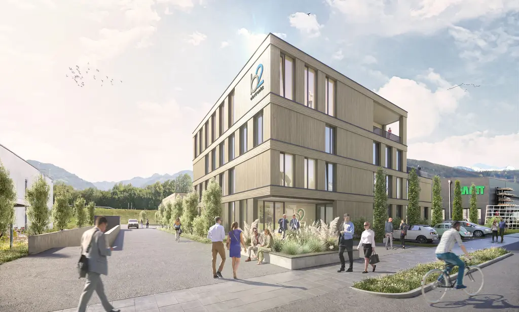 Das „b2 Excalibur Development Center“ ist ein zukunftsweisendes Betriebsgebäude in Holz-Beton-Hybridbauweise, das konsequent auf Nachhaltigkeit, Energieeffizienz und Ressourcenschonung ausgerichtet ist. Die elementierte Holzfassade, extensiv begrünte Dachflächen mit PV-Anlage sowie eine klimafreundliche Energieversorgung über Grundwasserbrunnen und Energiepfähle mit Wärmepumpentechnologie bilden zentrale Bausteine des Gebäudekonzepts. Ein flächendeckendes thermisch-aktives System sowie eine effiziente Lüftung mit Wärmerückgewinnung sorgen für hohen Komfort bei minimalem Energieeinsatz. Das Gebäude steht exemplarisch für integrale Planung und ökologische Bauweise im Gewerbebereich.