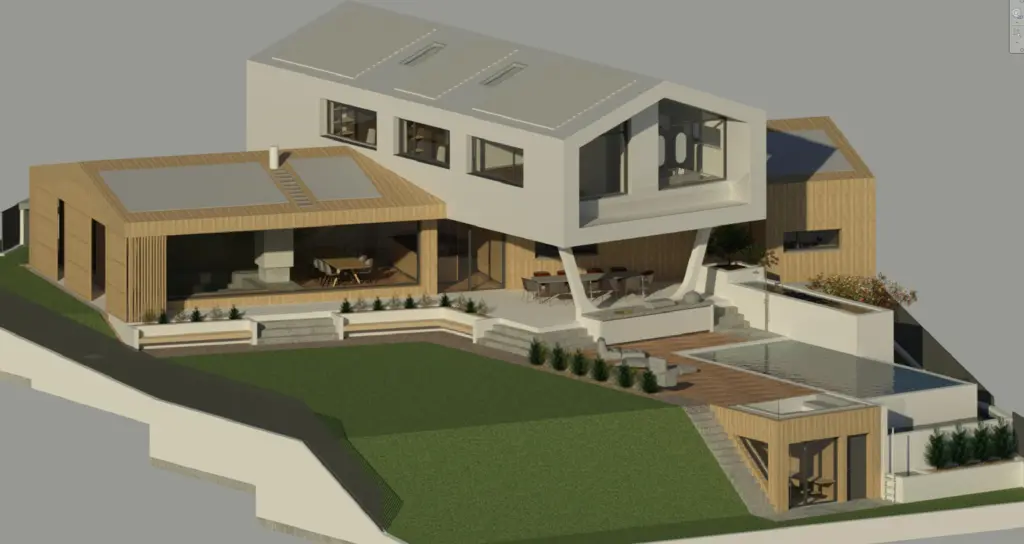Geplant ist ein zweigeschossiges nicht unterkellertes Einfamilienhaus samt Garagenzubau für zwei KFZ an der nordöstlichen Seite. Die Garage schließt dabei mit einer Wandseite (Brandwand) direkt an der Grundgrenze zum Grundstück 722/2 an. In dem Garagenzubau befindet sich ein Abstellraum und der Technikraum. Im Erdgeschoss ist eine vorgehängte Holzfassade vorgesehen und das Obergeschoss soll durch eine vorgehängte Metallfassade (Falzblechfassade) bekleidet werden. Das Dach wird mit einem Falzblechdach ausgeführt. Zusätzlich ist am Dach eine PV-Anlage für bis zu 20kWp geplant.