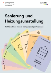 In der Broschüre „Sanierung und Heizungsumstellung“ finden Sie Hintergrundinformationen zu 46 Maßnahmen für den mehrgeschoßigen Wohnbau. Die Maßnahmen sind in zehn Themenfelder eingeteilt. Jede Maßnahme wird nach einem einheitlichen Schema beschrieben, um eine rasche Orientierung zu ermöglichen: allgemeine Beschreibung, Auswirkungen auf die Umwelt, baulicher Aufwand und zu erwartende Kosten.