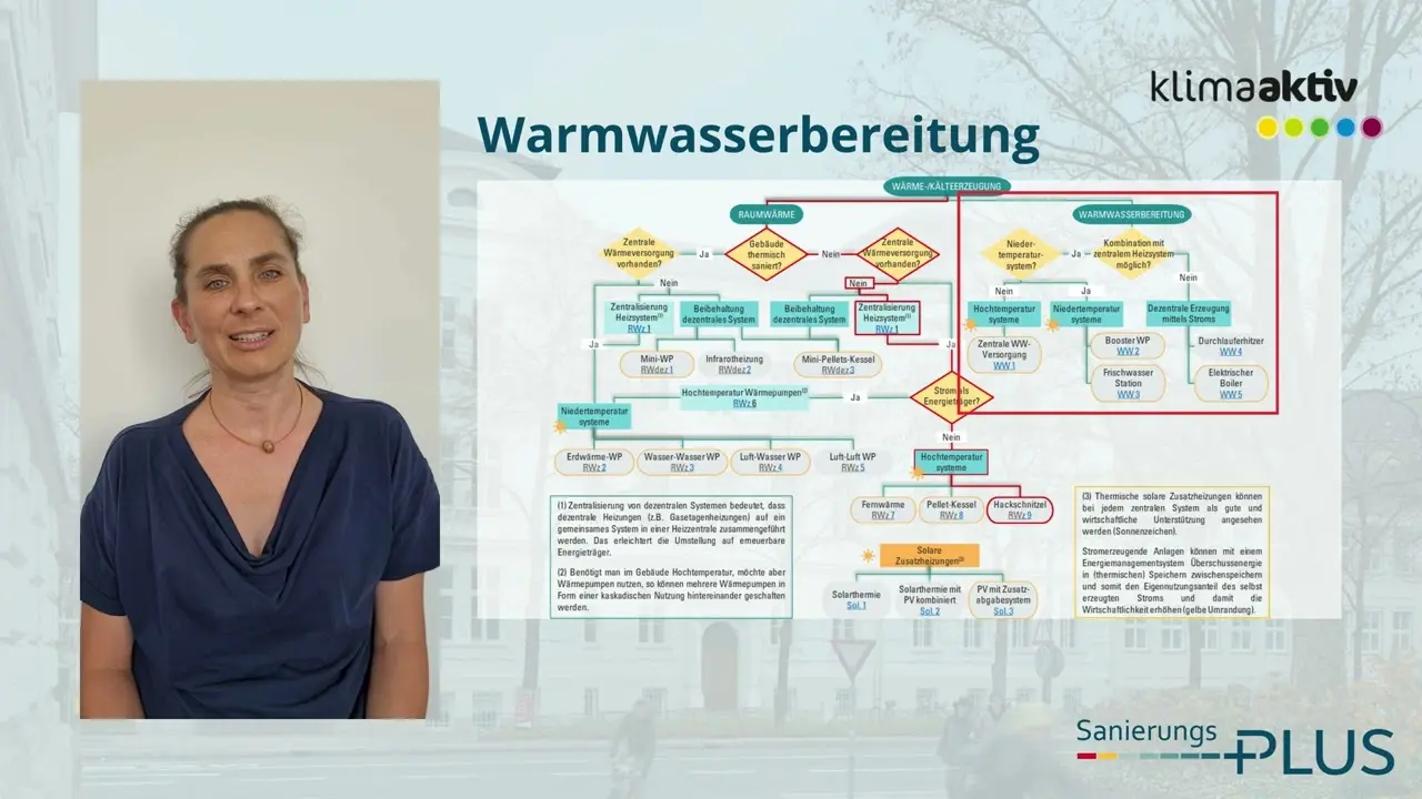 Es gibt es Entscheidungsbäume für die Reduzierung der Energieverbräuche, für den Umstieg auf erneuerbare Energieträger, für die Warmwasserbereitung und für die Abgabesysteme im Raum. So können auch für Gebäude, bei denen zum Beispiel nur einzelne Maßnahmen an der Gebäudehülle umgesetzt werden können oder bestehende Radiatoren weiter genutzt werden sollen, ökologische und wirtschaftliche Lösungen gefunden werden. Jede der knapp 70 Lösungen ist in einem Übersichtsblatt mit ihren Vor- und Nachteilen sowie der Anwendbarkeit und Effizienz beschrieben. Der Leitfaden entstand im Rahmen einer Arbeitsgruppe der IG Lebenszyklus Bau in Kooperation mit klimaaktiv.