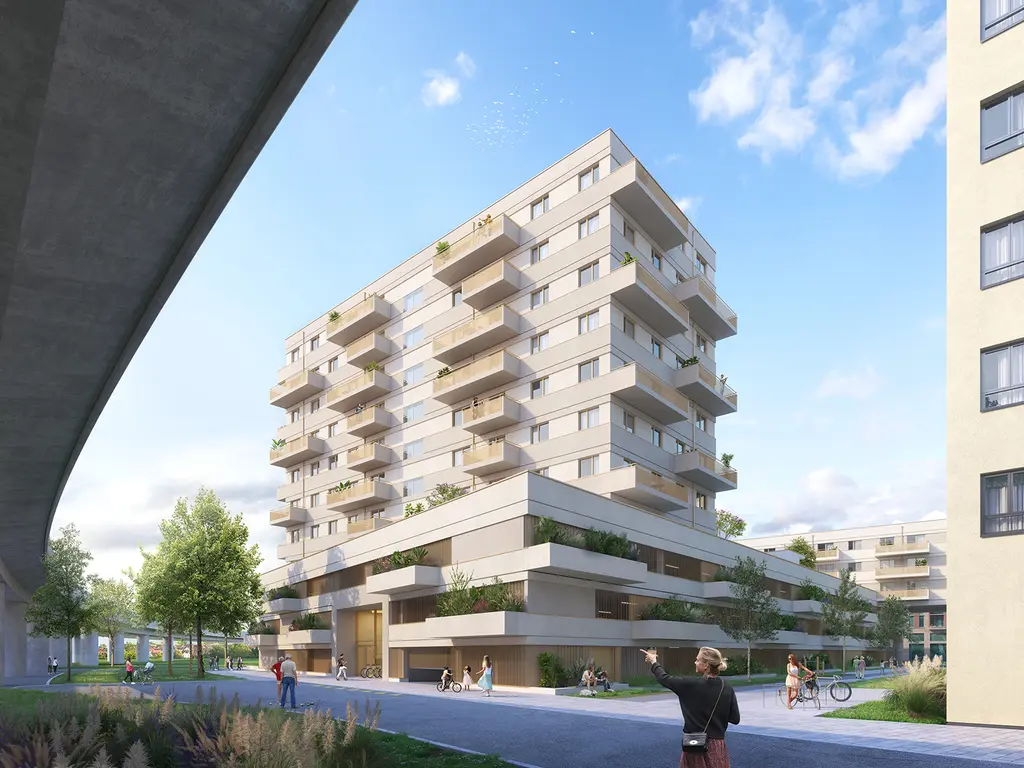 Im 22. Wiener Gemeindebezirk Donaustadt entsteht auf dem autofreien Areal Oberes Hausfeld das moderne Wohnprojekt M1 mit 113 Wohnungen. Das Gebäude gliedert sich in zwei Bauteile mit 11 bzw. 6 und 7 Geschossen, die sich harmonisch in die Umgebung einfügen. Für ein nachhaltiges Wohnkonzept sorgt das innovative Klima Loop® PLUS-Energiesystem mit