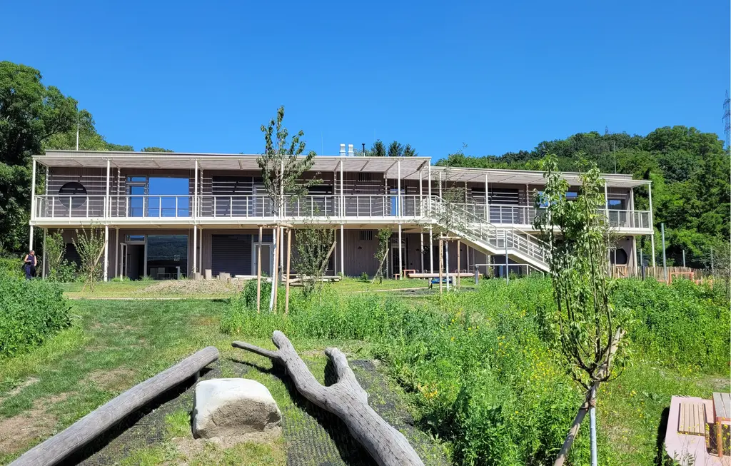 Das neue Gebäude wird am nördlichen Rand des Grundstücks situiert und öffnet sich nach Süden hin zur umgebenden Landschaft. Am Ende der Sackgasse sorgt ein Gebäuderücksprung für einen großzügigen, geschützten Vorplatz, der durch Baumpflanzung und Bankelemente von der Parkfläche getrennt wird. Es wird eine vielfältige unverwechselbare Welt für Kinder geschaffen. Ein Kindergarten der das Potential des Ortes mit den Anforderungen moderner Pädagogik verbindet. Es entsteht ein Ort mit wohnlichem Charakter in dem Gemeinschaft gelebt wird. Die einfache, klare Organisation erleichtert die Orientierung und schafft Übersicht und Offenheit.