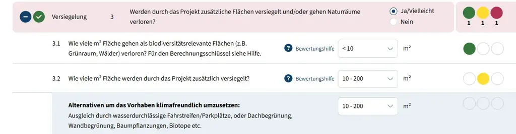 Mithilfe von einfachen Fragen stuft das Tool die CO2-Relevanz eines Vorhabens mittels Ampelsystem ein und gibt Empfehlungen, wie das Vorhaben klimafreundlich(er) umgesetzt werden kann. Zuerst wird durch einfache Ja-Nein-Fragen geprüft, ob ein Projekt grundsätzlich klimarelevant ist. Dann hilft ein Kriterienkatalog, die Auswirkungen genauer einzuschätzen. Ein Ampelsystem macht die Bewertung leicht verständlich und zeigt anschaulich, ob ein Projekt CO2-reduzierend wirkt, neutral bleibt oder Verbesserungsbedarf besteht. Ebenso stellt das Tool positive Auswirkungen auf das Klima dar und zeigt, wie diese noch erweitert werden kann.