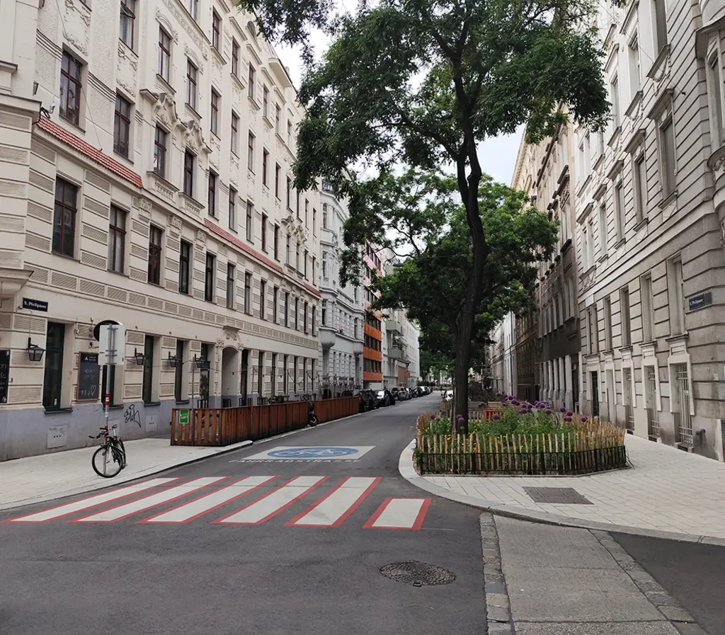 Die Argentinierstraße im 4. Bezirk wurde zu einer klimafitten Fahrradstraße umgestaltet. Auf einer Länge von rund 1,3 Kilometern erhielt die Fahrbahn einen markanten roten Belag nach niederländischem Vorbild, der den Vorrang des Radverkehrs deutlich macht und die Aufmerksamkeit erhöht. Ziel des Projekts war und ist, die Sicherheit für Radfahrende zu verbessern und den Straßenraum gleichzeitig attraktiver zu gestalten. Neben der neuen Radverkehrsführung wurden über 70 neue Bäume gepflanzt, 2.800 m² Fläche entsiegelt und zusätzliche Grünflächen angelegt. All dies trägt zur Abkühlung bei und verbessert das Mikroklima. Sitzgelegenheiten und neue Querungsmöglichkeiten erhöhen die Aufenthaltsqualität für Anrainer:innen und Passant:innen. Damit verbindet das Projekt eine klare Förderung der aktiven Mobilität mit wirksamen Maßnahmen zur Klimawandelanpassung.