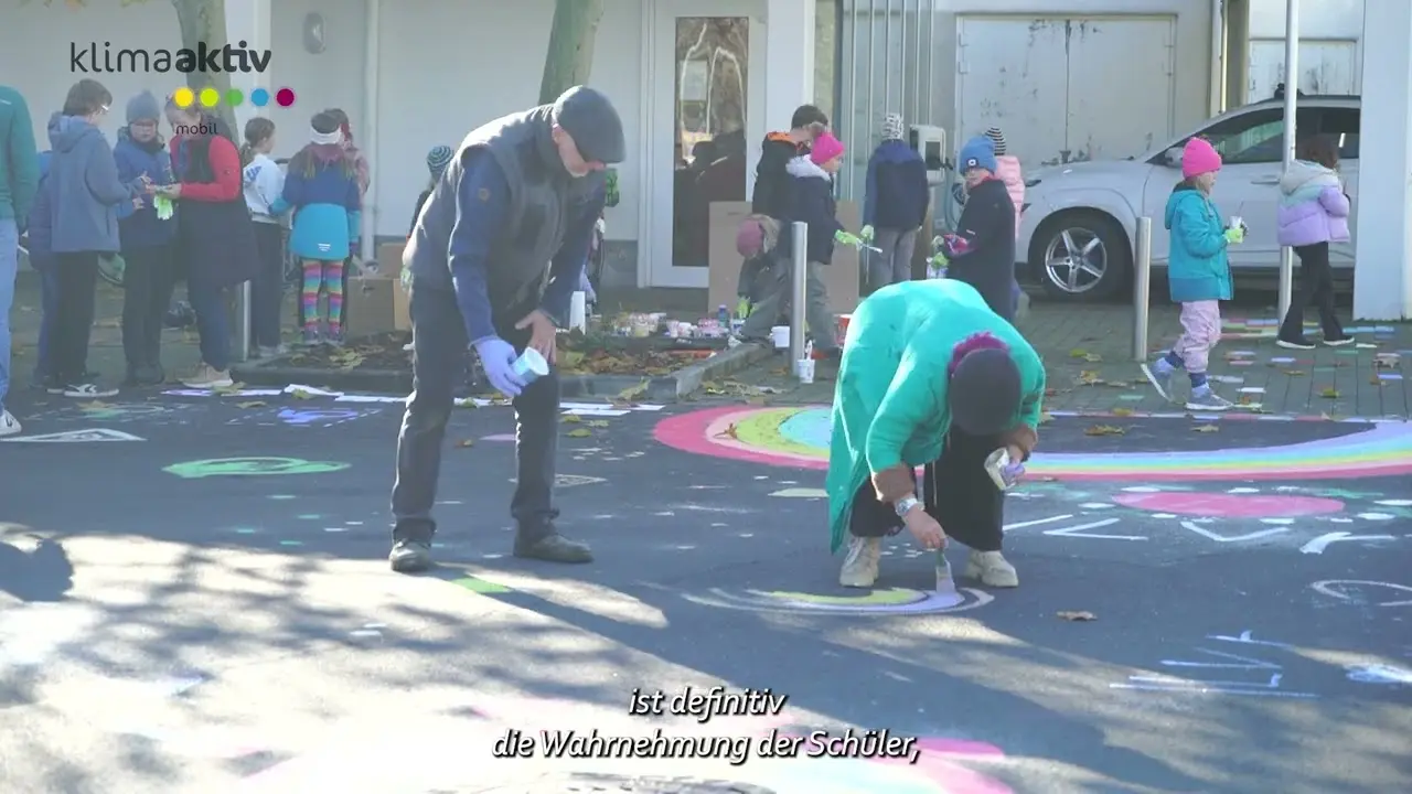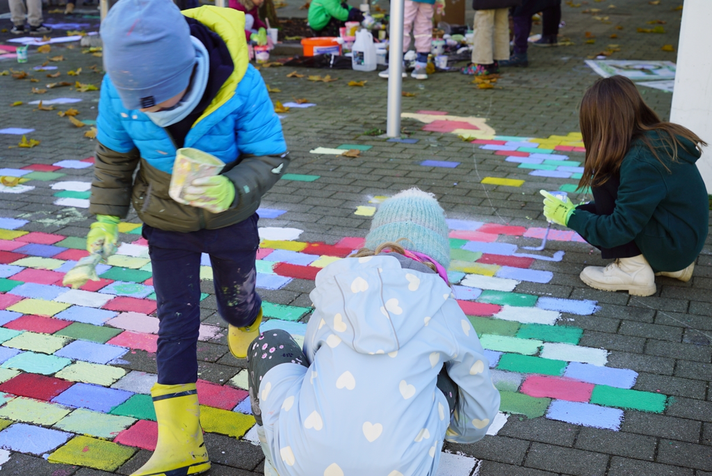 Im Rahmen einer Straßenmalaktion bemalte eine regionale Künstlerin gemeinsam mit den Kindern den Straßenraum vor der Schule. Ziel war es, die Autofahrenden auf die Begegnungszone aufmerksam zu machen und sie zu einer langsameren und achtsameren Fahrweise zu motivieren.
