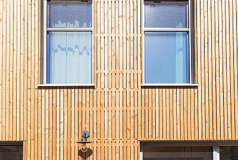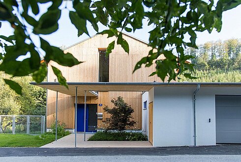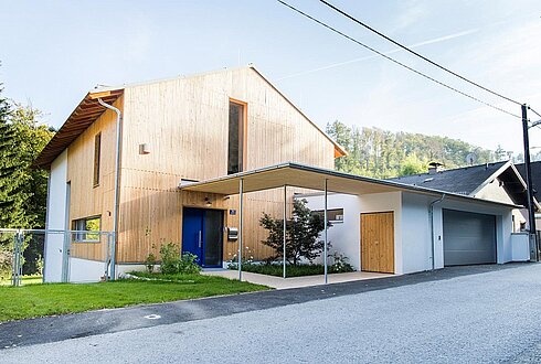 Das Janus-Haus in Gabliltz. Der Wienerwald bei Gablitz ist ein Refugium für Erholung suchende Städter. In einem Seitental mit üppiger Vegetation säumt eine Reihe Einfamilienhäuser den Straßenverlauf bis ans Ende des befahrbaren Teiles des Tals. Eines dieser Häuser wurde 2018 durch einen Neubau in Holzriegelbauweise ersetzt. Eine Wiener Familie hat sich hier ein neues Domizil geschaffen. Der Baukörper fügt sich unauffällig in die Reihe, der ihn umgebenden Bauten, ein. Zur Straße hin präsentiert sich das Gebäude giebelständig mit einem Satteldach und einer Holzfassade mit sehr schlanken Rippen, während es sich gartenseitig mit einem Walmdach und einer verputzten Fassade zeigt.