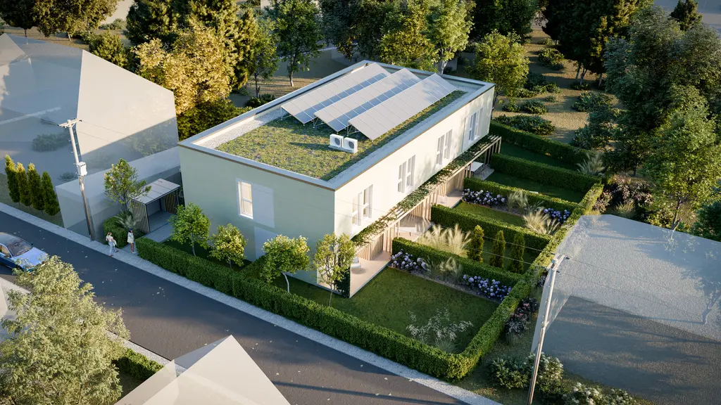 Assanierung im Rahmen der steiermärkischen Wohnbauförderung: Errichtung von vier Maisonette-Wohneinheiten anstelle eines baufälligen Einfamilienhauses. Jede Einheit verfügt über einen Eigengarten und das trotz zentraler Lage mit Anbindung an den öffentlichen Nahverkehr, Nahversorgung, Sporteinrichtungen und Schulen.