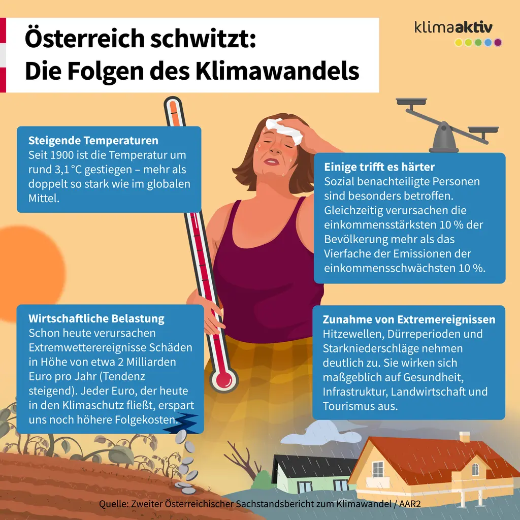 Gut zu wissen: Der bisherige Temperaturanstieg hat bereits jetzt starke Folgen auf unsere Gesellschaft: hitzebedingte Sterblichkeit, Ernteverluste durch Dürren, Schäden durch Hochwasser und Starkregen sowie Beeinträchtigungen bei der Wasserverfügbarkeit, bei den Grünlanderträgen und beim Skitourismus