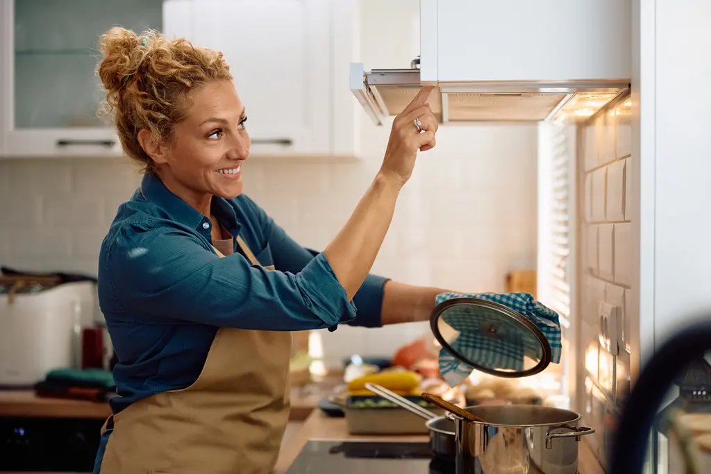 Schaltet man die Dunstabzugshaube ab, läuft diese noch ein wenig weiter, um auch die letzten Gerüche einzusaugen, bevor sie sich nach einer bestimmten Zeit von allein abschaltet. Wenn Ihre Dunstabzugshaube nicht über eine Nachlauffunktion verfügt, lassen Sie sie nach dem Kochen noch fünf bis zehn Minuten laufen, um die Raumluft gründlich zu reinigen.