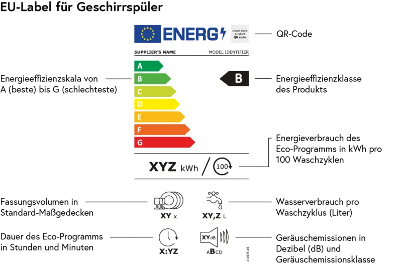 Seit 2021 gibt es für Geschirrspüler das EU-Energielabel mit einer Effizienzskala von A bis G (altes Label: A+++ bis G). Auf dem Label ist zusätzlich ein QR-Code aufgedruckt. Dieser verweist auf die EU-Produktdatenbank EPREL, in der weitere Produktinformationen zu finden sind. Auf dem aktuellen Label wird der Energieverbrauch für Geschirrspüler nicht mehr pro Jahr, sondern für 100 Betriebszyklen angegeben. Das ermöglicht Konsument:innen eine einfachere Berechnung des voraussichtlichen Stromverbrauchs. Neben dem gewichteten Wasserverbrauch pro Zyklus wird auch die Dauer des „Eco 40-60“-Programms angeführt. Die Geräuschemission und Geräuschemissionsklasse werden ebenfalls ausgewiesen.