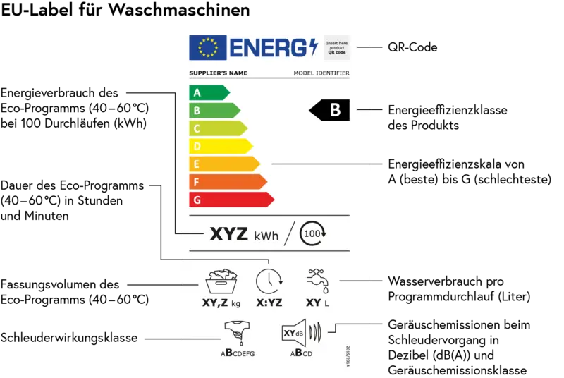 2021 wurde die Skala von A+++ bis G durch ein aktualisiertes Energieeffizienzlabel von A bis G ersetzt. Das Label verlinkt zudem mittels QR-Code auf die EU-Produktdatenbank EPREL, in der weitere Produktinformationen zu finden sind. Der Energieverbrauch und die Effizienzdaten basieren überwiegend auf neuen Testmethoden. Das Label gibt Auskunft über den Energieverbrauch pro 100 Waschzyklen. Das ermöglicht Konsument:innen eine einfache Berechnung des voraussichtlichen Stromverbrauchs. Neben dem gewichteten Wasserverbrauch pro Waschgang wird auch die Dauer des „Eco 40-60“-Programms angeführt. Die Geräuschemission beim Schleudern und die Geräuschemissionsklasse sind ebenfalls zu finden.