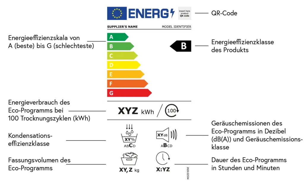 Seit 1. Juli 2025  gibt es für Wäschetrockner ein neues EU-Energielabel. Das aktuelle Label hat eine Effizienzskala von A bis G (altes Label A+++/G). Am Label ist außerdem ein QR-Code aufgedruckt. Dieser verweist auf die EU-Produktdatenbank EPREL, wo weitere Produktinformation zu finden sind.