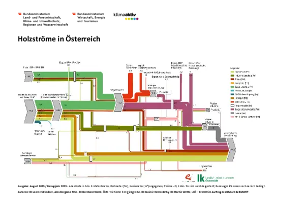 Die „Holzströme in Österreich“ stellen anschaulich die Mengenströme des Rohstoffs Holz von dessen Aufbringung (Einschlag, Import, sonstiges Aufkommen) über Verarbeitung (Sägeindustrie, sonstige Verarbeitung) bis hin zu den vielfältigen Verwendungen in der stofflichen und energetischen Nutzung dar. Zur Erstellung der Grafik wurden Daten aus unterschiedlichen Quellen der gesamten Wertschöpfungskette zusammengeführt.
