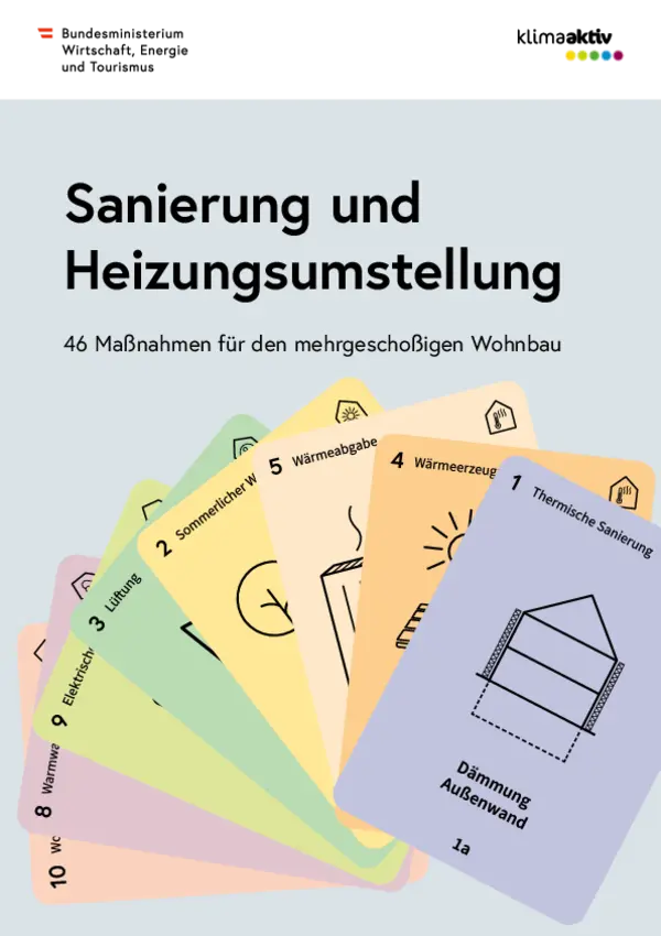In dieser 2025 überarbeiteten Broschüre und den dazu gehörenden Moderationskarten wird die große Bandbreite der möglichen Maßnahmen einer Sanierung und Heizungsumstellung von Mehrfamilienhäusern systematisch aufbereitet und abgebildet. Damit unterstützen wir die Begleitung und Moderation von Gesprächen, in denen Betroffene die möglichen Maßnahmen der Sanierung und Heizungsumstellung erörtern und eine Vorgehensweise beschließen. Bauträger, Planungsbüros, Hausverwaltungen u.a. haben die Möglichkeit, Moderationskarten zu bestellen via klimaaktiv@oegut.at