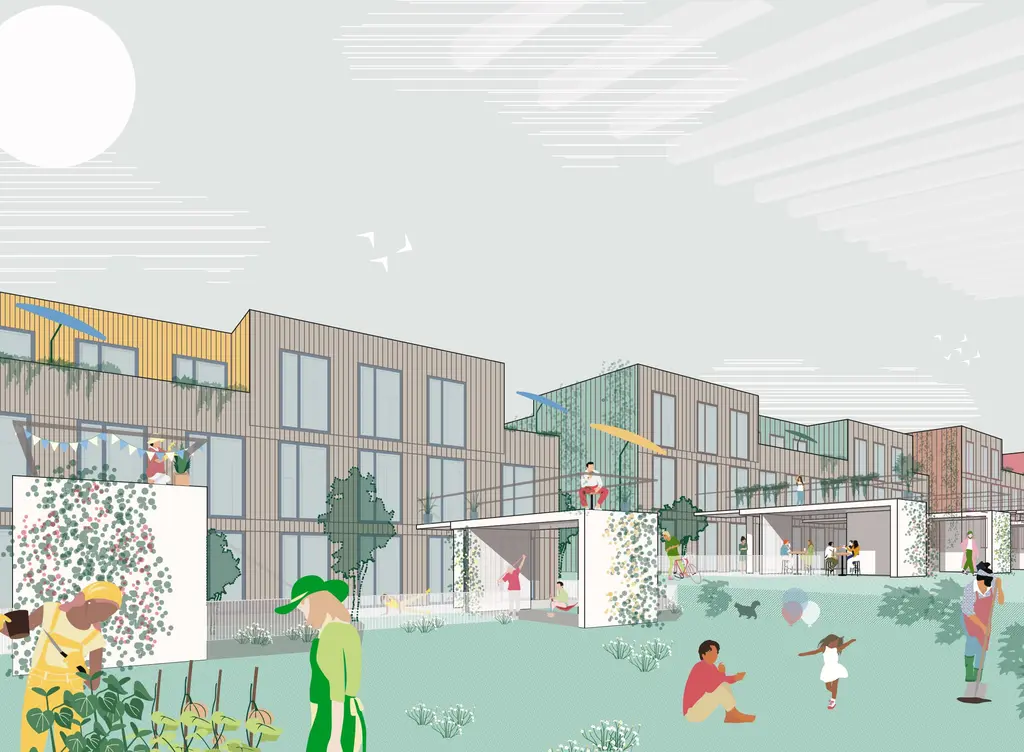 Das geplante Projekt zielt auf die Umsetzung eines ökologisch und sozial nachhaltigen Leuchtturmprojektes ab. Die Siedlung „Am Wienerfeld West“ basiert auf kompakten, vorgefertigten Holz-Hybrid-Häusern mit zwei Haustypen, die emissionsarm und klimafreundlich mit minimalem Betoneinsatz errichtet werden. Dank hoher Vorfertigung, gezielter Materialwahl und baubegleitender Qualitätssicherung werden schnelle Montage, Rückbaubarkeit, Recyclingfähigkeit und eine gesunde Innenraumluft gewährleistet. Heizung, Kühlung und Warmwasser werden durch eine Luftwärmepumpe in Kombination mit Bauteilaktivierung und Fußbodenheizung zur effizienten Temperaturregulierung bereitgestellt, während eine Aufdach-Photovoltaikanlage den Strom für die Pumpe zu wichtigen Betriebszeiten nachhaltig liefert.