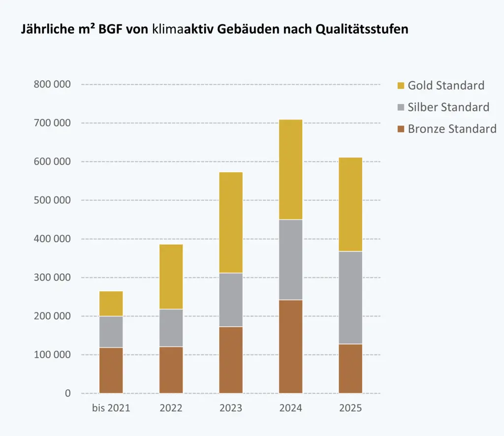 Per Ende 2025 erreichte mehr als die Hälfte der klimaaktiv Gebäude die höchste Qualitätsstufe Gold. Insgesamt 831 Gebäude mit einer Bruttogrundfläche von rund 3 Mio. m2 wurden bisher in dieser Qualitätsstufe zertifiziert. Mit ein Grund für diesen Erfolg ist die Tatsache, dass immer mehr Förderungen, Richtlinien und Vorgaben von Bund und Ländern auf die Qualitätskriterien von klimaaktiv referenzieren.