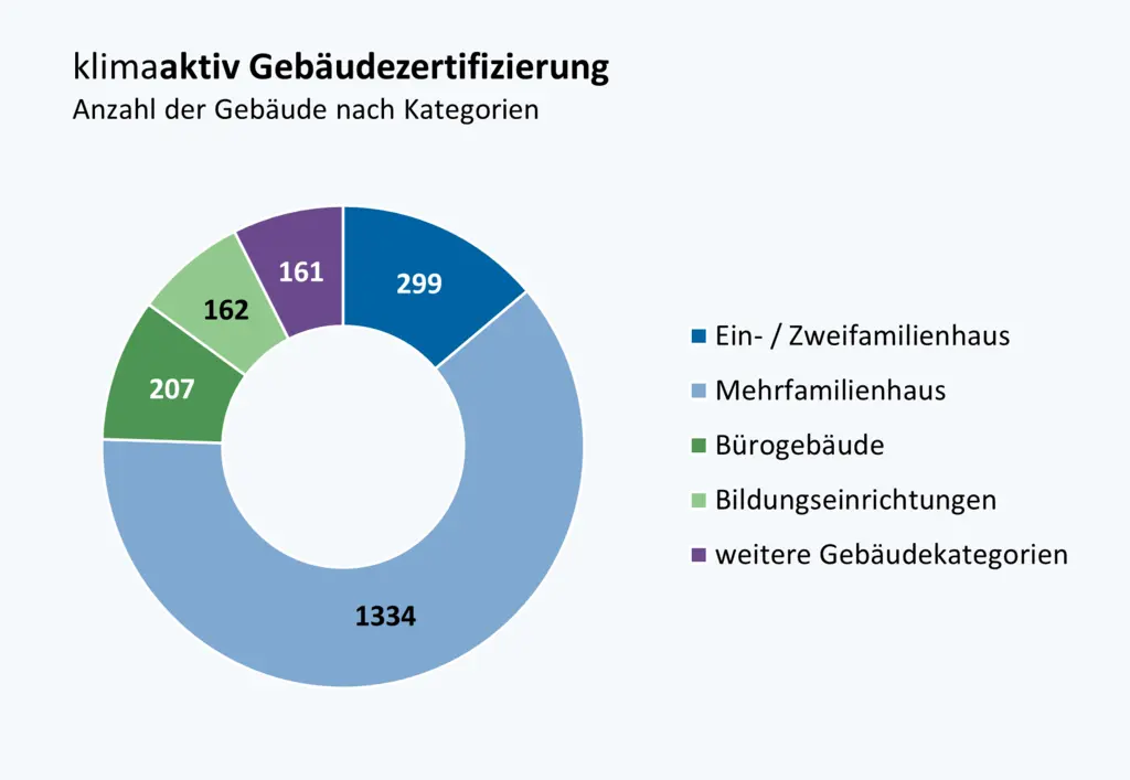 Die Kategorie Wohngebäude umfasst mit insgesamt 1.633 zertifizierten Objekten den größten Teil der klimaaktiv Gebäude. 530 sind Dienstleistungsgebäude, die sich in unterschiedlichen Kategorien aufteilen: Neben Bürogebäuden und Bildungseinrichtungen sind unter „weitere Gebäude“ Gaststätten, Gebäude des Groß- und Einzelhandels, Krankenhäuser, Pflegeheime, Produktionsstätten sowie religiöse Einrichtungen oder Veranstaltungsstätten zusammengefasst.