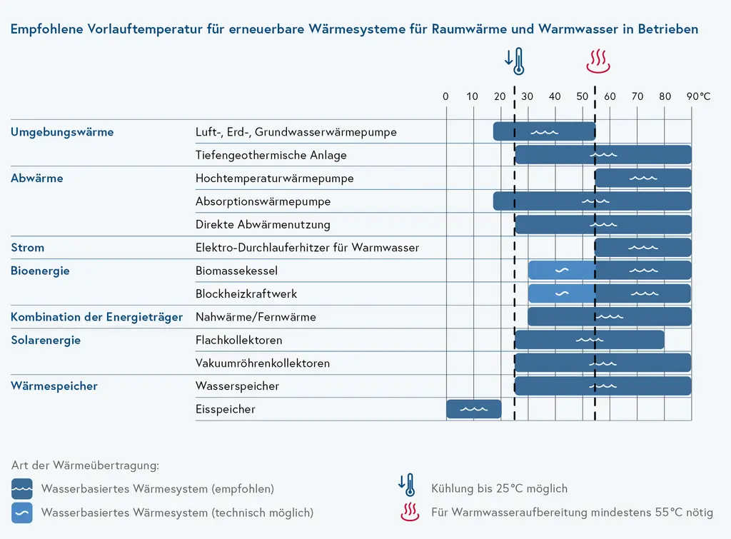Nach Feststellung der notwendigen Vorlauftemperatur folgt die Auswahl des geeigneten Wärmeerzeugungssystems. In der folgenden Abbildung werden Wärmetechnologien nach ihrer Hauptenergiequelle und den empfohlenen Vorlauftemperauren dargestellt. Zudem wird die Möglichkeit der Wärmespeicherung angeführt.