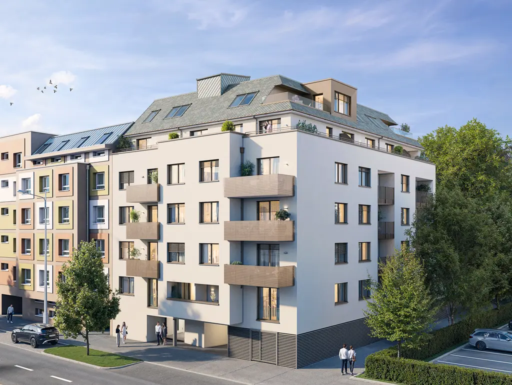 Die Wohnhausanlage umfasst eine Stiege mit insgesamt 27 Wohnungen sowie 12 Stellplätzen. Das Gebäude erstreckt sich über ein Kellergeschoss, Erdgeschoss, fünf Obergeschosse und ein Dachgeschoss. Besondere Nachhaltigkeitsmerkmale sind die zentrale Luftwärmepumpenanlage zur Wärme-, Kälte- und Warmwasserversorgung sowie eine Photovoltaikanlage am Flachdach zur Eigenstromerzeugung. Hochwertige, langlebige Baustoffe, ein effizientes Wärmedämmverbundsystem und moderne Energiestandards gewährleisten einen ressourcenschonenden Betrieb. Die Anlage bietet zeitgemäßen Wohnkomfort, Barrierefreiheit und eine zukunftsfähige Infrastruktur mit digitaler Verbrauchserfassung.